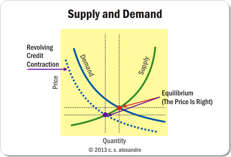 The key phrase is “finance private consumption,” an expectation that is now the economic status quo, although it was never meant to be. Most everyone knows about supply and demand, and for illustration purposes the chart that follows clearly demonstrates the principle as it relates to equilibrium and price discovery. But there are factors that need to be explored.
