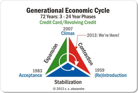 Then there’s velocity of money, and the chart above doesn’t require deep analysis, apart from the fact that deflationary and weak economic activity is in play, and cash hoarding is in fashion. The graphic that follows illustrates the Generational Economic Cycle theory with the credit card/revolving credit domain in place.