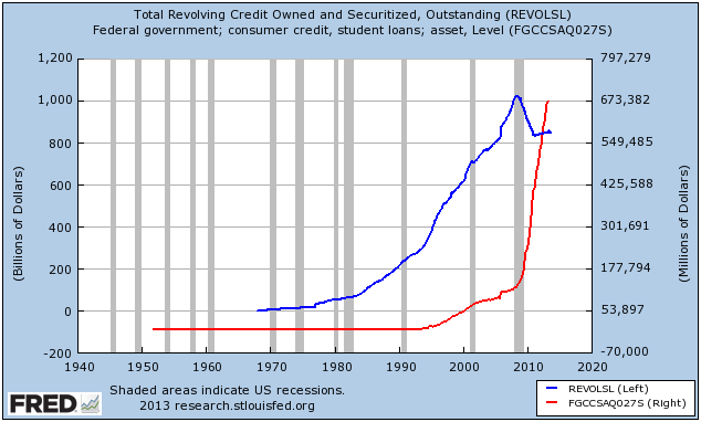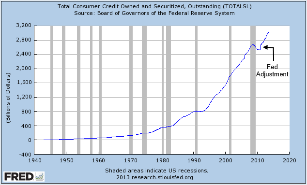 Many believe that the credit market is on the mend, but that belief is faulty. A review of the recent Consumer Credit - G.19 report highlights the weakness, with revolving credit declining from $1,005.2 trillion to $814.7 billion between 2008 and September 2013, a 18.96% reduction. Meanwhile, non-revolving credit increased from $1,646.2 trillion to $2,218.7 trillion, a 34.78% increase. To clarify, non-revolving loans in this Fed report include student, personal and auto, but not mortgages.
