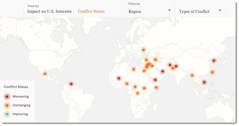 The Global Conflict Tracker, an interactive tool from the Council on Foreign Relations, provides a broad human and geographical context regarding conflicts that is often missed by the daily news. There are common and predictable denominators across the board, and anyone with an unbiased eye can easily identify them — a.k.a. connecting the inconvenient dots.