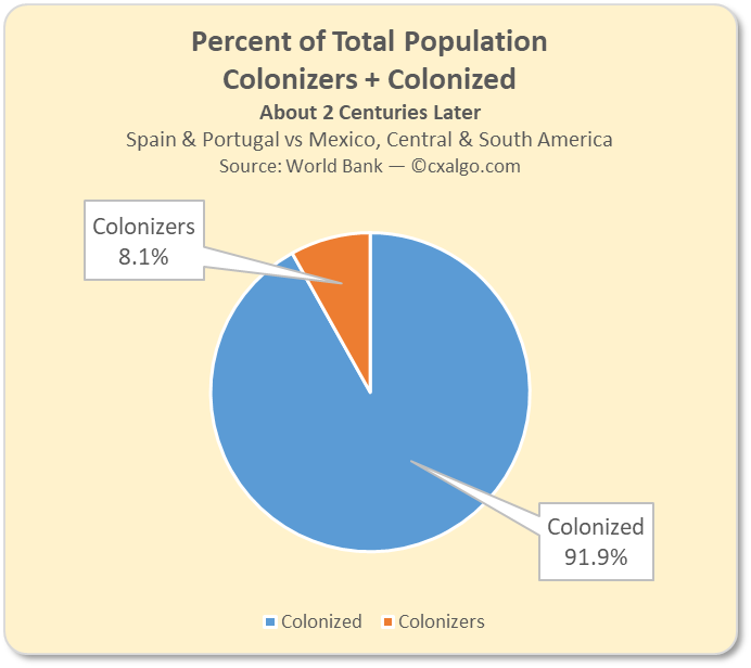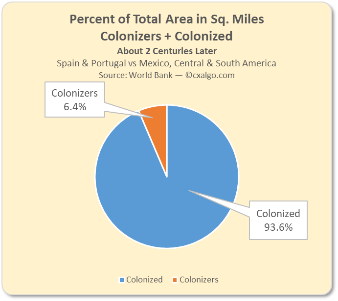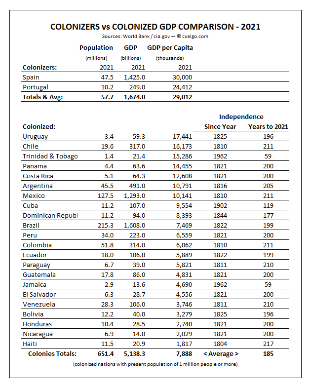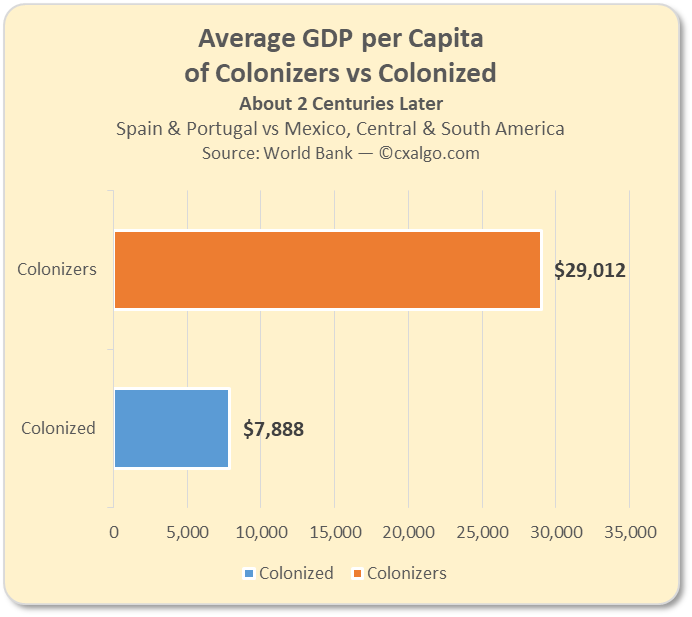 Considering that Spain and Portugal are not as strong economically as the United Kingdom or France, among others, the comparison only gets worse for the Colonized if the other European Colonizers are added along with Africa and Asia on the Colonized side of the formula. The GDP gap is much wider.