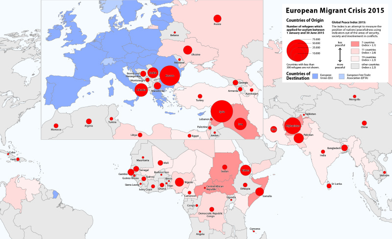 The maps titled "European Migrant Crisis 2015" and courtesy of Maximilian Dörrbecker, show the number of asylum applicants in Europe by country of origin and destination for the period between January 1 and June 30, 2015, a mere six months. It's impossible to ignore that the bulk of the movement is toward countries with deep pockets and/or appealing social safety nets, although those welfare mechanisms were designed for their citizens, not economically distressed tourists.