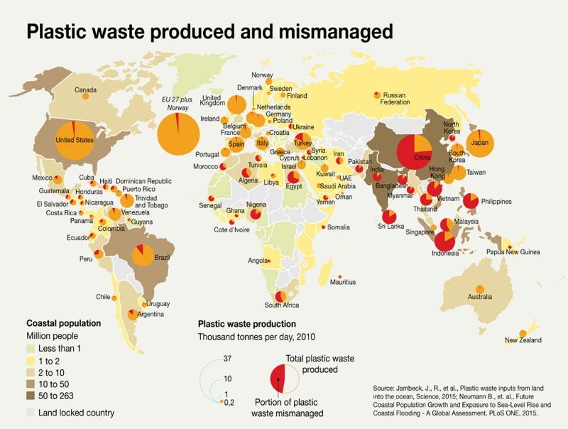 And that brings us to the root cause of the problem as the map titled "Plastic waste produced and mismanaged" so clearly illustrates in red. Western Civilization's mass consumption of plastic is definitely not the culprit, but rather the mismanagement of plastic waste by virtually everyone else, which is a cultural issue. Thus, the logical penalty must be that a person in Seattle cannot use a plastic straw because someone in Indonesia dumped 10 pounds of plastic bottles into a river? Seriously?