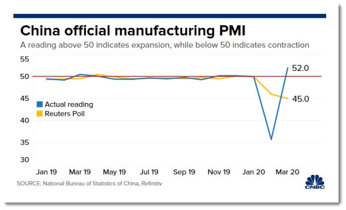 To illustrate Chinese crapola, let's take the Purchasing Manager's Index (PMI), where readings above 50 indicate economic expansion, and those below that level signal contraction. China's official manufacturing PMI jumped to 52.0 in March 2020 from the February's record low of 35.7, or resuming growth while the country was on lockdown. Must have been all those colorful and powerful Chinese dragons firing on all cylinders.